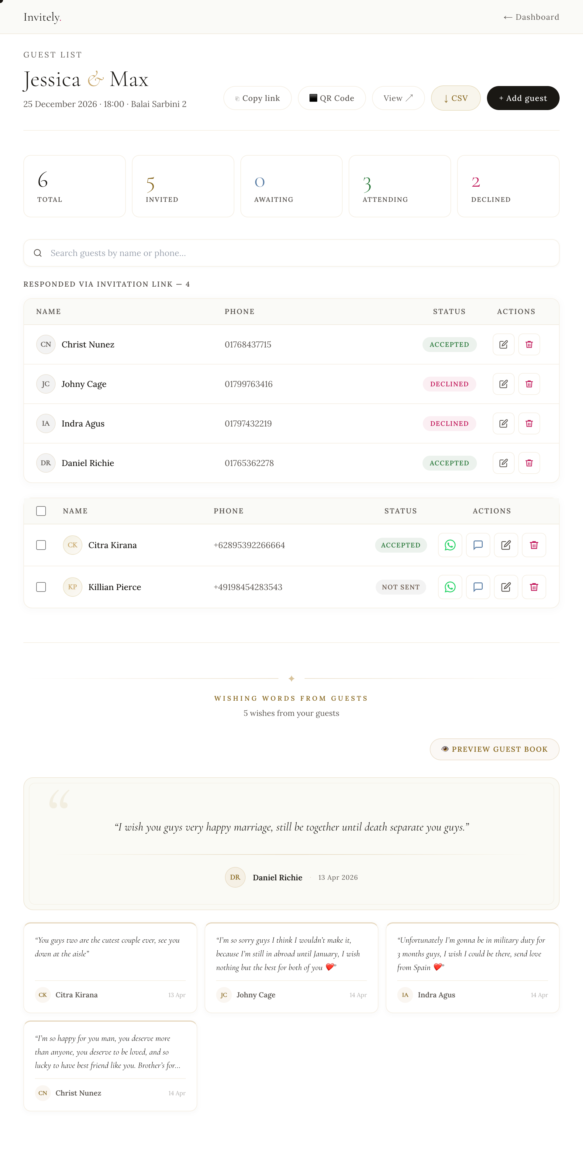 Track RSVPs, send invites via WhatsApp, manage your guest list, and collect heartfelt wishes — all from your dashboard.